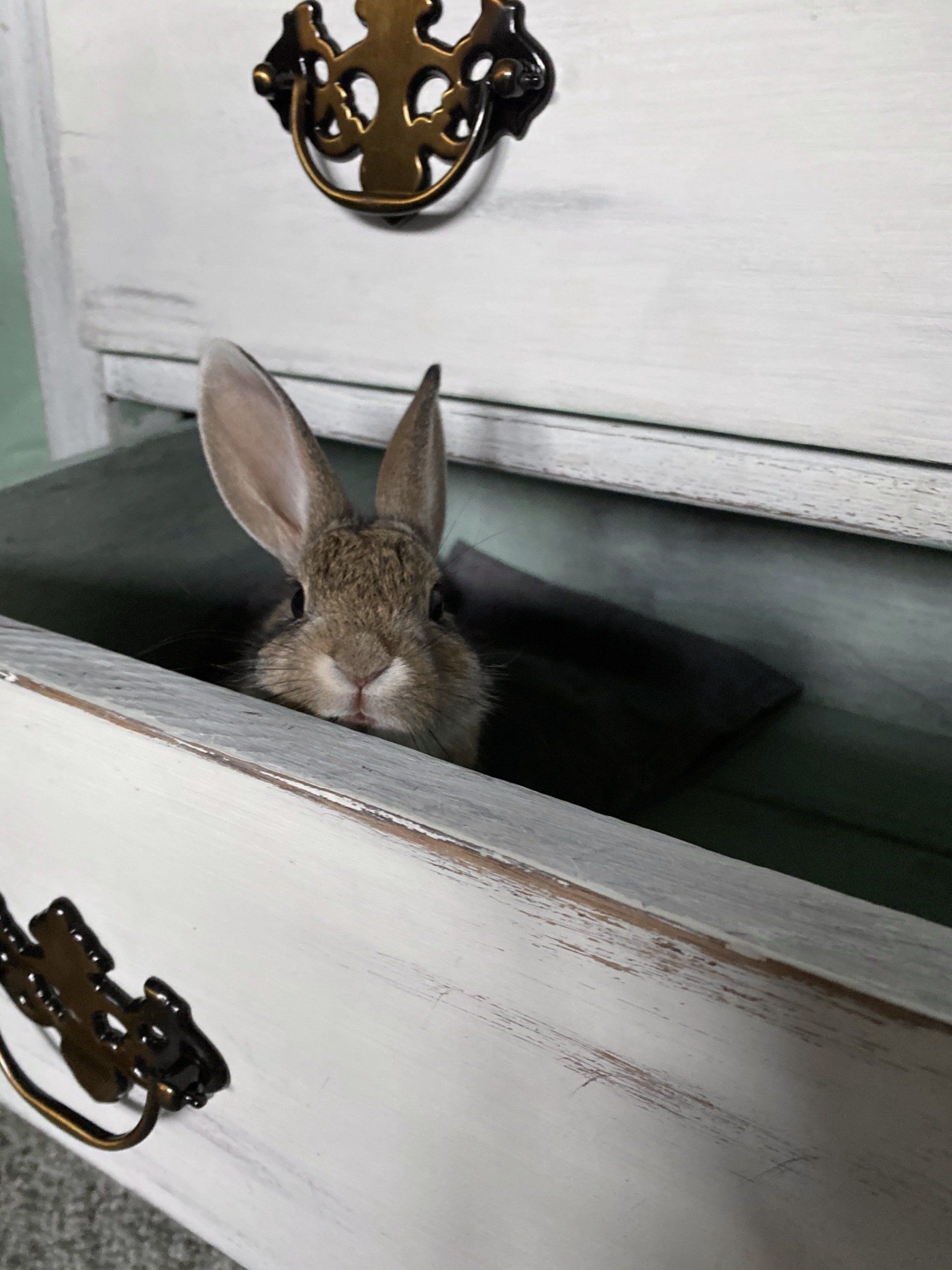 The vet office told me kitten formula is what I should feed the bunny, and good luck! I had no idea when his last meal was. Quickly, I grabbed a cage that failed for our hamster and made him comfortable in it. I rushed to the pet store and bought kitten formula and all that we needed to attempt to give this bunny a chance to explore the world! Getting formula and feeding him every 2-3 hours throughout day and night was at first a challenge but not the only one. The other challenge came on the day he arrived; how will he keep his body heat while sleeping at night? As he needs his family to curl up with and stay warm. The more research I did, the more challenges arose. Luckily our neighbors had a lizard and an extra heating pad we borrowed in an attempt to keep his body temperature. Bunny survived his first night with us. We named him Hopsie, as that one ended up the winner out of the few we thought of. Every day, there were challenges, and he was developing fast.